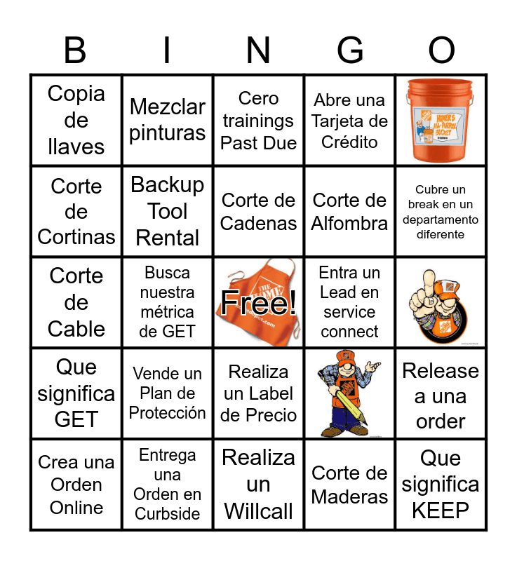 This bingo card has 4 images, a free space and 24 words: Release a una order, Back up cashier, Corte de Alfombra, Corte de Maderas, Corte de Cortinas, Cero trainings Past Due, Mezclar pinturas, Que significa GET, Entra un Lead en service connect, Crea una Orden Online, Corte de Cable, Abre una Tarjeta de Crédito, Entrega una Orden en Curbside, Realiza un Willcall, Cubre un break en un departamento diferente, Haz rosca a un tubo, Vende un Plan de Protección, Backup Tool Rental, Corte de Cadenas, Realiza un Label de Precio, Copia de llaves, Entra un Pro xtra, Que significa KEEP and Busca nuestra métrica de GET.
