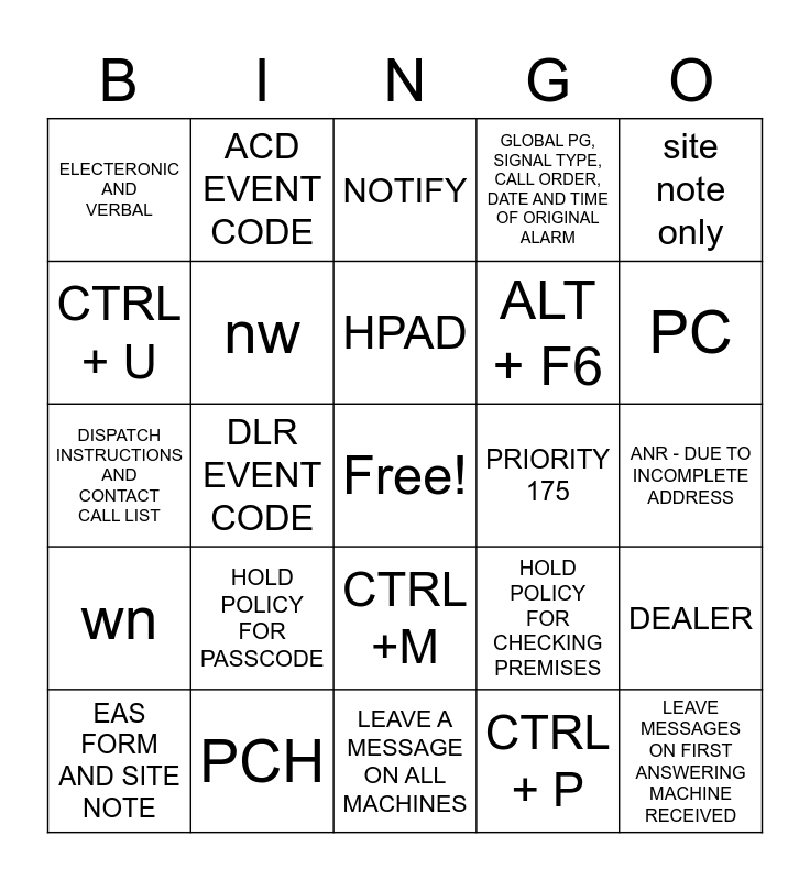 This bingo card has a free space and 34 words: MEDICAL, CTRL + P, ALT + F8, nc, wn, nw, site note only, EAS FORM AND SITE NOTE, ACD EVENT CODE, CD EVENT CODE, HPAD, NOTIFY, VFA, PNA, PRIORITY 175, PC, PCH, DISPATCH INSTRUCTIONS AND CONTACT CALL LIST, HOLD POLICY FOR PASSCODE, HOLD POLICY FOR CHECKING PREMISES, CTRL +M, RCD, ELECTERONIC AND VERBAL, ANR - DUE TO INCOMPLETE ADDRESS, LEAVE A MESSAGE ON ALL MACHINES, LEAVE MESSAGES ON FIRST ANSWERING MACHINE RECEIVED, GLOBAL PG, SIGNAL TYPE, CALL ORDER, DATE AND TIME OF ORIGINAL ALARM, CTRL + O, ALT + F6, CTRL + U, CARBON MONOXIDE, DLR EVENT CODE, DEALER and SERVCO.