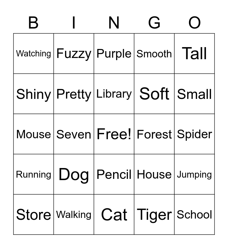 This bingo card has a free space and 24 words: Dog, Walking, Library, Store, Tall, Watching, Shiny, Fuzzy, Forest, Pencil, Soft, Mouse, House, Jumping, Pretty, Tiger, Spider, Purple, Small, Seven, School, Running, Smooth and Cat.