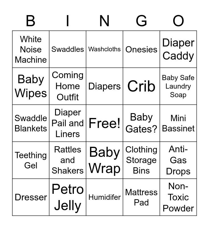 This bingo card has a free space and 75 words: Infant Tub and Bath Seat?, Soft Hooded Towels, Washcloths, Baby-Safe Body Wash, Baby-Safe Shampoo, Baby-Safe Body Lotion, Bath Toys, Faucet Cover, Bath Rinser, Bath Kneeler, Bath Thermo State, Bath Item Storage, Diapers, Baby Wipes, Diaper Rash Cream and Balm, Diaper Pail and Liners, Diaper Bag, Non-Toxic Powder, Changing Table, Diaper Caddy, Cotton Receiving Blankets, Swaddle Blankets, Coming Home Outfit, Swaddles, Onesies, Sleep N Plays, Shirt and Pant Sets, Footed Sleepers, Booties and Socks, Mittens and Hats, Baby Hangers and Dividers, SnapUp Rompers, Baby Shoes, Clothing Storage Bins, Baby Safe Laundry Soap, Crib, Crib Mattress, Crib Sheets, Mini Bassinet, Mattress Pad, Changing Table, Changing Pad, Changing Pad Cover/Liners, Light Dimmer/Night Light, Baskets or bins for storage, Hamper, Dresser, White Noise Machine, Baby Monitor, Infant Car Seat/Base/Stroller, Baby Carrier, Baby Wrap, Playpen/Pack N Play, Portable changing pad, Shades for Vehicles, Play Mat/Activity Pad, Pacifiers/Teething Toys, Baby Jumper, Soft Books, Soothing Musical Toys, Rattles and Shakers, Baby Swing, Bouncer, Infant Grooming Kit (Nail trimmer), Thermometer, Aspirator, Baby Gates?, Outlet Caps and Knob Covers, Edge and Corner Guards, Infant Fever Reducer, Anti-Gas Drops, Teething Gel, Petro Jelly, Toilet Lid Locks?, Humidifer and Electrical Cord Tie-Ups.