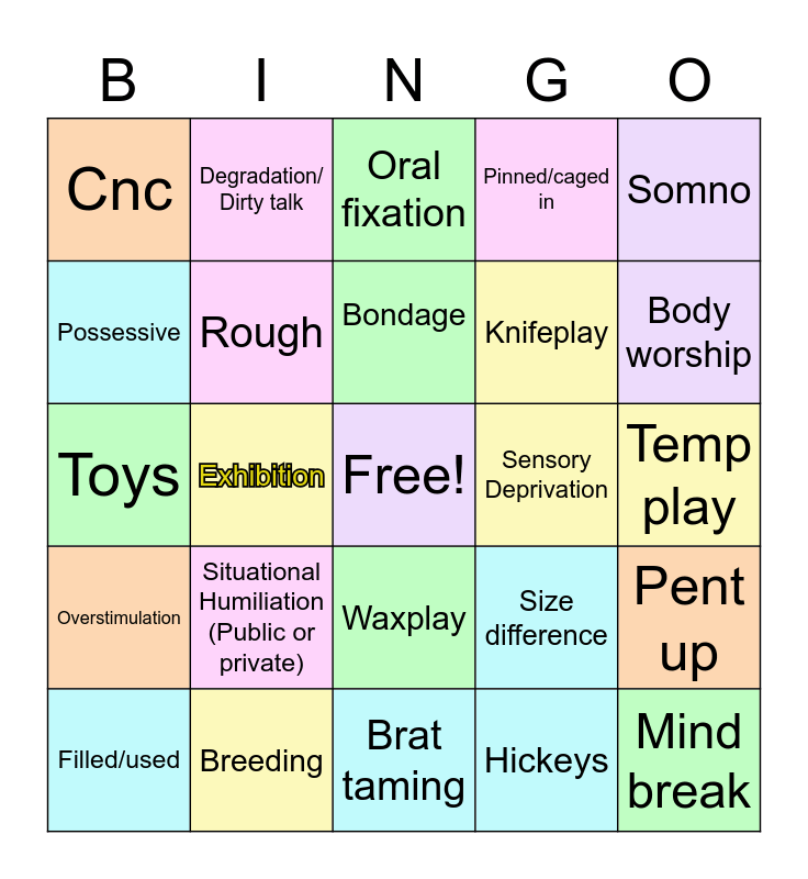 This bingo card has a free space and 24 words: Situational Humiliation (Public or private), Breeding, Bondage, Filled/used, Somno, Cnc, Possessive, Degradation/ Dirty talk, Sensory Deprivation, Waxplay, Knifeplay, Toys, Size difference, Pent up, Rough, Hickeys, Temp play, Oral fixation, Body worship, Exhibition, Mind break, Overstimulation, Pinned/caged in and Brat taming.