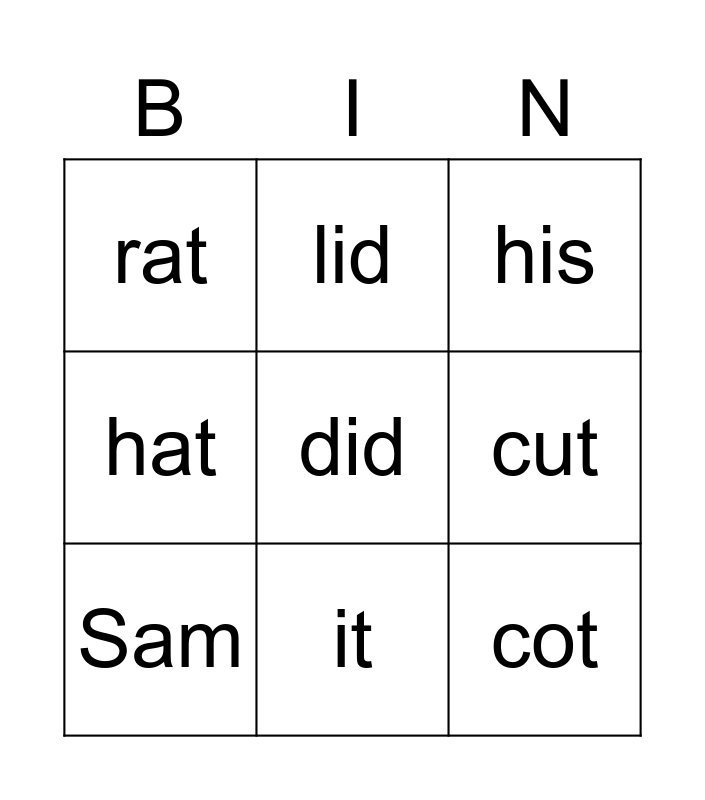 This bingo card has 36 words: at, mat, sat, Sam, dad, am, it, sit, did, sad, mad, hat, him, hit, ham, rat, rim, ram, rid, his, as, is, hot, lot, tot, lid, dot, cat, cot, cut, us, mud, but, the, I and a.