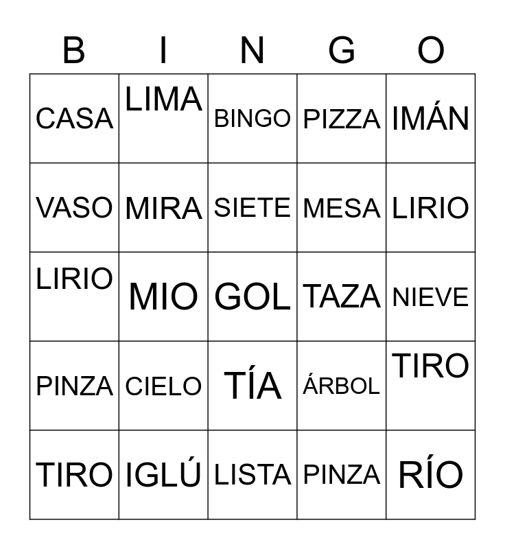 This bingo card has a free space and 24 words: CIELO, IGLÚ, SIETE, TIRO, IMÁN, CASA, VASO, LIMA, TAZA, TÍA, MESA, LIRIO, ÁRBOL, TIRO, MIRA, PINZA, NIEVE, BINGO, LIRIO, MIO, RÍO, PINZA, PIZZA and LISTA.