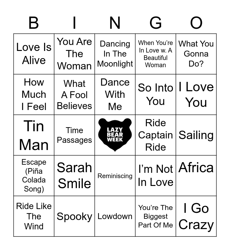 This bingo card has a free space and 50 words: Cool Night, Spooky, Just Remember I Love You, You’re The Biggest Part Of Me, Africa, Imaginary Lover, You Are The Woman, Sharing The Night Together, So Into You, You Belong To Me, How Much I Feel, What A Fool Believes, I’m Not In Love, I Go Crazy, Key Largo, Thunder Island, Dancing In The Moonlight, Ride Captain Ride, Dream Weaver, Love Is Alive, Sarah Smile, Lowdown, When You’re In Love w. A Beautiful Woman, I Love You, Love Is The Answer, Sad Eyes, Dance With Me, Baby Come Back, What You Gonna Do?, Escape (Piña Colada Song), I’d Really Love To See You Tonight, If You Leave Me Now, Baker Street, On and On, Nights Are Forever Without You, Summer Breeze, I Just Wanna Be Your Everything, More Than I Can Say, You’re The Only Woman, Tin Man, When I Need You, Love Will Find A Way, Takin’ It To The Streets, Lonesome Loser, Ride Like The Wind, Time Passages, Reminiscing, Hey Nineteen, Sailing and Get Closer.