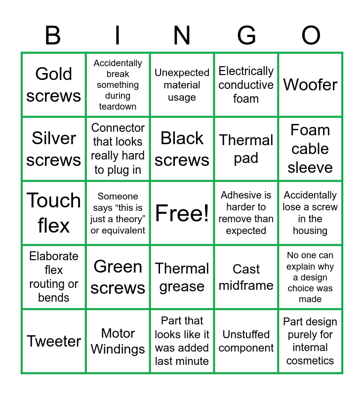 This bingo card has a free space and 24 words: Green screws, Motor Windings, Black screws, Tweeter, Woofer, Gold screws, Silver screws, Accidentally break something during teardown, Adhesive is harder to remove than expected, Thermal grease, Thermal pad, Touch flex, Cast midframe, No one can explain why a design choice was made, Connector that looks really hard to plug in, Unstuffed component, Accidentally lose a screw in the housing, Unexpected material usage, Foam cable sleeve, Someone says “this is just a theory” or equivalent, Part design purely for internal cosmetics, Elaborate flex routing or bends, Electrically conductive foam and Part that looks like it was added last minute.
