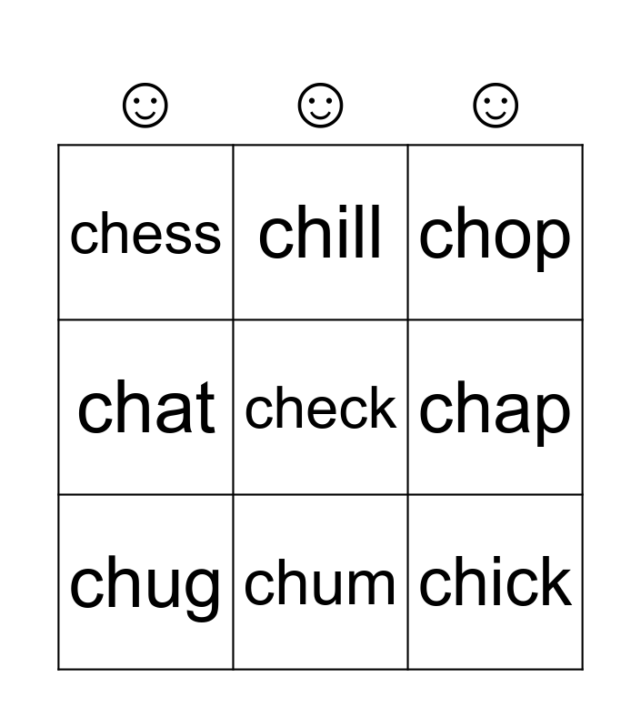 This bingo card has 9 words: chug, chop, chill, chat, chess, chap, check, chick and chum.