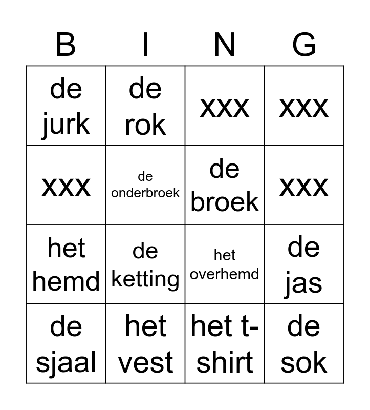 This bingo card has 16 words: het vest, de jas, xxx, de jurk, het hemd, de rok, het overhemd, het t-shirt, xxx, de onderbroek, de sjaal, xxx, de ketting, xxx, de broek and de sok.