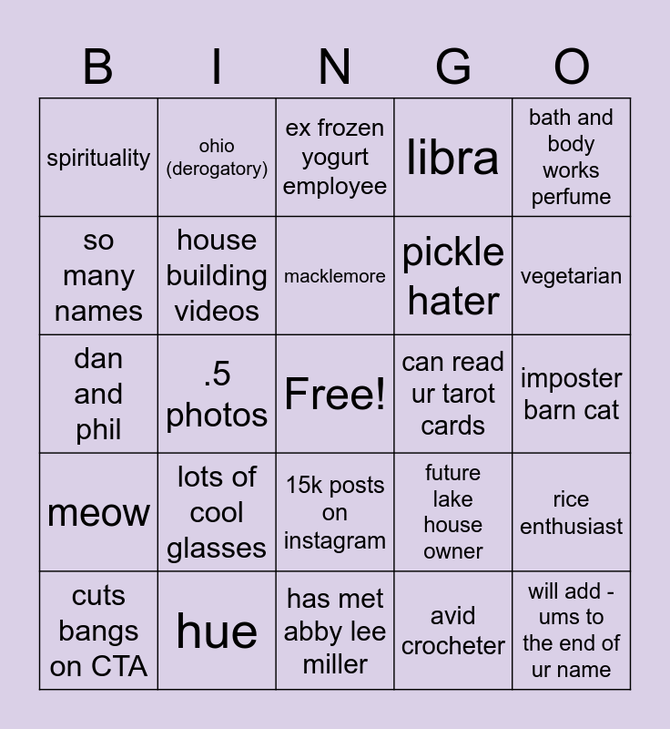 This bingo card has a free space and 24 words: lots of cool glasses, hue, macklemore, cuts bangs on CTA, bath and body works perfume, spirituality, so many names, ohio (derogatory), can read ur tarot cards, 15k posts on instagram, pickle hater, dan and phil, future lake house owner, rice enthusiast, house building videos, avid crocheter, imposter barn cat, ex frozen yogurt employee, vegetarian, .5 photos, will add -ums to the end of ur name, meow, libra and has met abby lee miller.
