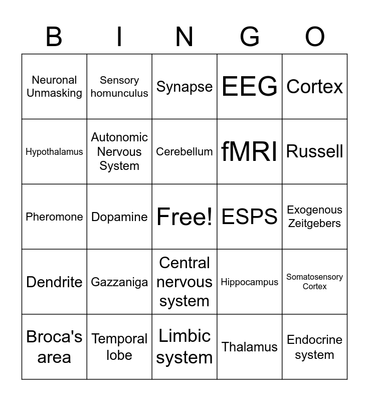 This bingo card has a free space and 39 words: ACTH, Amygdala, Axon, Autonomic Nervous System, Broca's area, Central nervous system, Cerebellum, Corpus Callosum, Cortex, Dendrite, Dopamine, EEG, Endocrine system, Exogenous Zeitgebers, ESPS, Gazzaniga, BRAC, Neuronal Unmasking, SCN, Hippocampus, Hypothalamus, Limbic system, fMRI, Russell, Neuron, Occipital Lobe, Parietal lobe, Peripheral nervous system, Reflex, Sensory homunculus, Serotonin, Spinal cord, Synapse, Temporal lobe, Thalamus, Threshold, Somatosensory Cortex, Pheromone and Siffre.