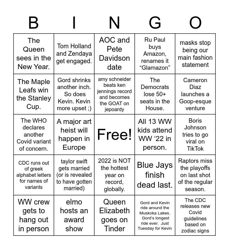 This bingo card has a free space and 24 words: taylor swift gets married (or is revealed to have gotten married), elmo hosts an award show, amy schneider beats ken jennings record and becomes the GOAT on jepoardy, WW crew gets to hang out in person, masks stop being our main fashion statement, The Queen sees in the New Year., The Maple Leafs win the Stanley Cup., Tom Holland and Zendaya get engaged., All 13 WW kids attend WW ‘22 in person., 2022 is NOT the hottest year on record, globally., The Democrats lose 50+ seats in the House., The WHO declares another Covid variant of concern., Blue Jays finish dead last., Raptors miss the playoffs on last shot of the regular season., Gord shrinks another inch. So does Kevin. Kevin more upset ;), Gord and Kevin ride around the Muskoka Lakes. Gord’s longest ride ever. Just Tuesday for Kevin, Boris Johnson tries to go viral on TikTok, AOC and Pete Davidson date, Cameron Diaz launches a Goop-esque venture, A major art heist will happen in Europe, The CDC releases new Covid guidelines based on zodiac signs, CDC runs out of greek alphabet letters for names of variants, Ru Paul buys Amazon, renames it “Glamazon” and Queen Elizabeth goes on Tinder.