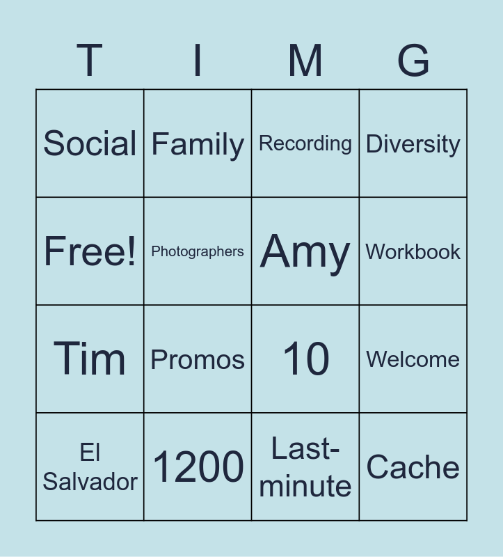 This bingo card has 16 words: 1200, Welcome, Recording, Social, Tim, Family, 10, Last-minute, Free!, Photographers, El Salvador, Diversity, Promos, Workbook, Amy and Cache.