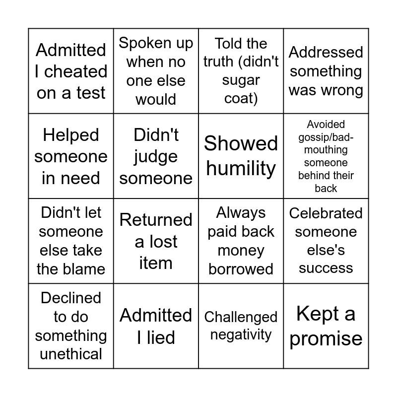 This bingo card has 16 words: Admitted I lied, Celebrated someone else's success, Told the truth (didn't sugar coat), Admitted I cheated on a test, Didn't let someone else take the blame, Spoken up when no one else would, Always paid back money borrowed, Challenged negativity, Helped someone in need, Didn't judge someone, Declined to do something unethical, Addressed something was wrong, Returned a lost item, Avoided gossip/bad-mouthing someone behind their back, Showed humility and Kept a promise.