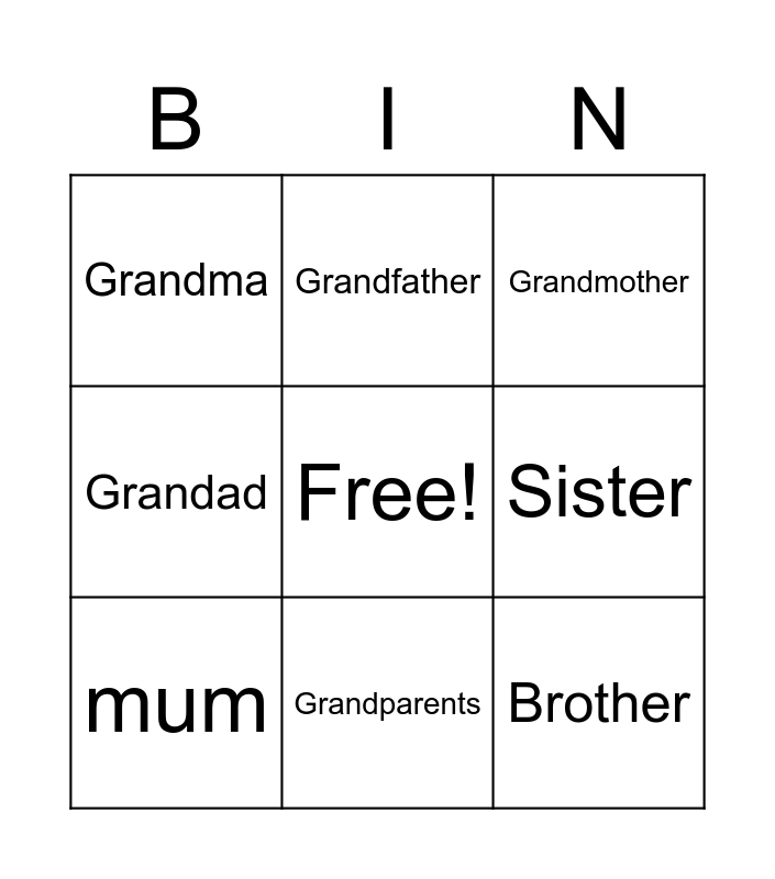 This bingo card has a free space and 12 words: Father, Mother, Brother, Sister, Grandfather, Grandmother, Grandparents, Parents, Grandma, Grandad, mum and dad.
