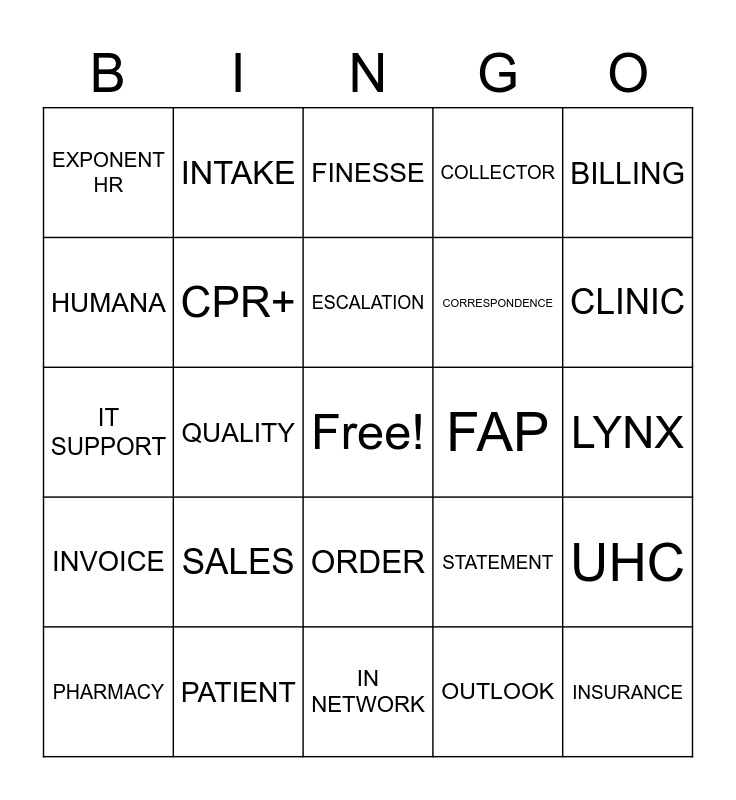 This bingo card has a free space and 29 words: PHARMACY, JABBER, QUALITY, ADVISOR, EXPONENT HR, FINESSE, CPR+, SALES, FAP, PATIENT, LYNX, INSURANCE, IN NETWORK, OUTLOOK, CLINIC, WAYSTAR, ORDER, INVOICE, BILLING, IT SUPPORT, STATEMENT, VERIPHY, CORRESPONDENCE, HUMANA, COLLECTOR, INTAKE, UHC, ESCALATION and MEDICARE.