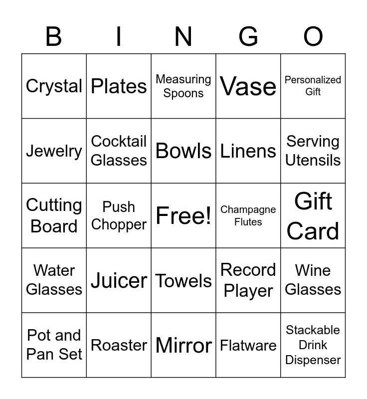 This bingo card has a free space and 27 words: Record Player, Air Fryer, Linens, Mirror, Jewelry, Measuring Spoons, Plates, Water Glasses, Champagne Flutes, Wine Glasses, Cutting Board, Vase, Pot and Pan Set, Roaster, Serving Utensils, Cooling Rack, Cocktail Glasses, Bowls, Juicer, Crystal, Gift Card, Flatware, Push Chopper, Stackable Drink Dispenser, Towels, Personalized Gift and Baking Pan.