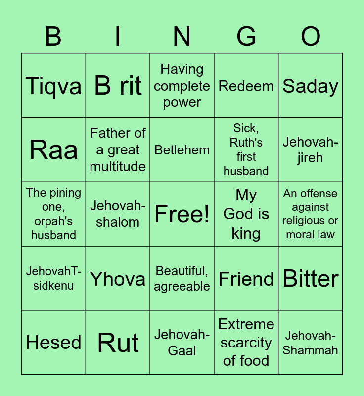 This bingo card has a free space and 24 words: Yhova, Rut, Betlehem, Hesed, Saday, Tiqva, Raa, B rit, My God is king, Beautiful, agreeable, Sick, Ruth's first husband, The pining one, orpah's husband, Friend, Bitter, Father of a great multitude, Extreme scarcity of food, An offense against religious or moral law, Having complete power, Jehovah-jireh, Jehovah-shalom, Jehovah-Shammah, JehovahT-sidkenu, Redeem and Jehovah- Gaal.