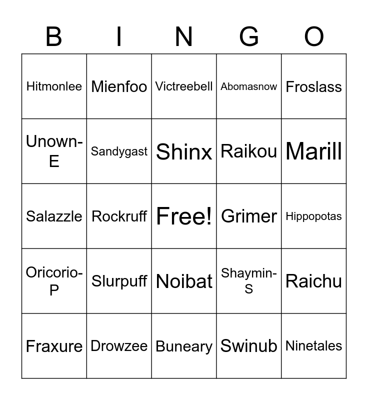 This bingo card has a free space and 901 words: Alakazam, Magmar, Slowking-G, Unown-A, Persian-A, Tropius, Giratina, Reuniclus, Tsareena, Chespin, Pawniard, Graveler-A, Tranquill, Bronzor, Kommo-o, Unown-U, Moltres, Amaura, Weavile, Purugly, Tapu Koko, Gastly, Mewtwo, Swanna, Dragalge, Honedge, Larvesta, Luxray, Porygon-Z, Comfey, Seaking, Unown-I, Weepinbell, Azurill, Regice, Wailord, Grovyle, Ivysaur, Oranguru, Cosmog, Unown-B, Pancham, Rotom-H, Palossand, Spoink, Ledyba, Skorupi, Koffing, Golett, Vanillish, Magcargo, Buzzwole, Turtwig, Espurr, Kakuna, Shieldon, Pignite, Cyndaquil, Sandslash-A, Qwilfish, Noibat, Terrakion, Pinsir, Hoppip, Sunflora, Chansey, Exeggutor-A, Eelektrik, Talonflame, Pheromosa, Jirachi, Ferroseed, Unown-K, Elekid, Weedle, Geodude-A, Electabuzz, Burmy-P, Registeel, Farfetch’d, Sliggoo, Simisage, Gorebyss, Haunter, Doublade, Dewpider, Burmy-T, Riolu, Darmanitan-G, Latios, Meowth-A, Thundurus-I, Wurmple, Honchkrow, Squirtle, Crabrawler, Wormadam-T, Marowak-A, Larvitar, Torchic, Sawsbuck-Winter, Rotom, Shroomish, Grotle, Spritzee, Ditto, Deoxys-A, Vulpix-A, Bellsprout, Tauros, Shellos-W, Roggenrola, Servine, Caterpie, Genesect, Unown-J, Lucario, Blaziken, Gigalith, Totodile, Druddigon, Arbok, Seadra, Sandygast, Weezing, Gothorita, Meowth, Typhlosion, Jolteon, Electivire, Jigglypuff, Helioptile, Miltank, Togepi, Latias, Pansage, Togedemaru, Maractus, Aurorus, Phantump, Cosmoem, Trubbish, Nidoking, Volcarona, Shelmet, Liepard, Girafarig, Magearna, Mienshao, Hypno, Bellossom, Ninetales-A, Entei, Pumpkaboo-S, Tapu Bulu, Malamar, Turtonator, Sentret, Galvantula, Pichu, Torkoal, Slakoth, Baltoy, Kyurem, Chimecho, Rowlet, Heracross, Shelgon, Altaria, Emolga, Golem-A, Mienfoo, Rockruff, Dedenne, Regigigas, Deoxys-S, Sawsbuck-Spring, Foongus, Manaphy, Dugtrio-A, Smeargle, Venonat, Tepig, Quagsire, Primarina, Abomasnow, Rotom-W, Skuntank, Gabite, Timburr, Quilladin, Ninjask, Krabby, Jellicent, Cherrim, Tentacool, Wailmer, Rayquaza, Snivy, Heatmor, Mr. Mime-G, Vileplume, Aromatisse, Lycanroc-Dusk, Dragonair, Shellos-E, Serperior, Unown-F, Igglybuff, Raichu, Doduo, Golurk, Carbink, Deerling-Spring, Deerling-Summer, Quilava, Gloom, Yanma, Mime Jr., Unown-C, Lycanroc-Midday, Unown-N, Eelektross, Kingdra, Torracat, Crabominable, Corsola, Boldore, Tentacruel, Piloswine, Beautifly, Spearow, Ponyta, Whimsicott, Surskit, Virizion, Roselia, Magikarp, Machamp, Mamoswine, Grimer, Articuno-G, Lairon, Leavanny, Dhelmise, Rhydon, Yanmega, Wartortle, Nincada, Kabuto, Unown-L, Meowth-G, Jangmo-o, Buneary, Barboach, Chatot, Omastar, Avalugg, Roserade, Sceptile, Bergmite, Graveler, Nidoqueen, Unown-X, Woobat, Beldum, Masquerain, Palpitoad, Sunkern, Gliscor, Whiscash, Tornadus-I, Pyroar, Swablu, Meloetta, Krokorok, Metagross, Manectric, Infernape, Sandshrew, Skarmory, Medicham, Porygon, Swoobat, Aron, Sawsbuck-Autumn, Slugma, Throh, Rhyperior, Remoraid, Dartrix, Kartana, Klink, Natu, Type: Null, Banette, Yamask-G, Skiploom, Minccino, Togetic, Garchomp, Loudred, Greninja, Mismagius, Seel, Nidorina, Sneasel, Ampharos, Mareep, Mareanie, Sudowoodo, Vanillite, Cobalion, Cherubi, Phione, Accelgor, Spinda, Politoed, Pidgey, Ho-Oh, Salandit, Simipour, Basculin-W, Golisopod, Zeraora, Clawitzer, Slowbro-G, Duosion, Ambipom, Pikipek, Karrablast, Shaymin, Machop, Zygarde-10, Huntail, Beartic, Pidove, Floatzel, Fletchinder, Gastrodon-W, Simisear, Persian, Noivern, Golbat, Murkrow, Snorunt, Slaking, Espeon, Patrat, Walrein, Landorus-I, Stakataka, Drampa, Slowpoke, Shinx, Happiny, Volbeat, Gulpin, Sharpedo, Unown-Z, Croagunk, Fennekin, Tynamo, Machoke, Mew, Meditite, Sandile, Kirlia, Unown-M, Steenee, Mothim, Exploud, Pikachu, Wormadam-P, Aerodactyl, Pineco, Musharna, Trevenant, Meganium, Aipom, Lurantis, Scolipede, Scizor, Kadabra, Piplup, Incineroar, Unown-P, Stunfisk, Rotom-FR, Solosis, Omanyte, Morelull, Duskull, Minior-R, Empoleon, Stufful, Cubone, Hippowdon, Staravia, Escavalier, Charmander, Deino, Goodra, Pachirisu, Mandibuzz, Oricorio-P, Stantler, Dragonite, Nuzleaf, Samurott, Audino, Swellow, Articuno, Lombre, Muk-A, Charjabug, Bastiodon, Bounsweet, Corphish, Arcanine, Pelipper, Grumpig, Ralts, Pidgeot, Bayleef, Raticate-A, Horsea, Butterfree, Bronzong, Wimpod, Froslass, Combee, Diancie, Nihilego, Eevee, Lapras, Zapdos, Beedrill, Purrloin, Lampent, Bunnelby, Ribombee, Oricorio-S, Oddish, Litleo, Gyarados, Delibird, Conkeldurr, Ponyta-G, Litten, Magnemite, Oricorio-B, Heatran, Zebstrika, Darumaka, Xerneas, Lunatone, Spheal, Buizel, Xatu, Venomoth, Diggersby, Delcatty, Nidorino, Electrike, Panpour, Binacle, Abra, Gengar, Keldeo-O, Wobbuffet, Blacephalon, Magmortar, Nidoran, Torterra, Archeops, Spinarak, Sandshrew-A, Muk, Gible, Lopunny, Marowak, Cranidos, Thundurus-T, Clefairy, Blastoise, Umbreon, Blitzle, Toxicroak, Bouffalant, Amoonguss, Fletchling, Mightyena, Zoroark, Unown-!, Seismitoad, Budew, Vullaby, Swadloon, Porygon2, Meowstic, Marshadow, Nidoran-F, Carracosta, Combusken, Slowbro, Aggron, Bidoof, Frillish, Mantine, Unown-T, Cacturne, Toucannon, Luvdisc, Mankey, Diglett-A, Vibrava, Primeape, Solrock, Tyrogue, Magneton, Zorua, Landorus-T, Alomomola, Darmanitan, Rotom-M, Deerling-Winter, Hydreigon, Unfezant, Jynx, Gumshoos, Magby, Clamperl, Unown-E, Camerupt, Exeggutor, Voltorb, Yveltal, Solgaleo, Tornadus-T, Kricketune, Flabébé-R, Geodude, Litwick, Zubat, Vanilluxe, Fearow, Snorlax, Mr. Mime, Araquanid, Glameow, Makuhita, Paras, Frogadier, Swirlix, Regirock, Sewaddle, Lilligant, Chinchou, Gligar, Taillow, Golduck, Crustle, Lugia, Celebi, Sandslash, Drifblim, Deoxys-D, Cinccino, Azumarill, Unown-W, Yungoos, Metang, Whismur, Hitmontop, Victreebell, Silvally, Breloom, Carvanha, Marshtomp, Exeggcute, Volcanion, Shaymin-S, Basculin-R, Hoopa-C, Moltres-G, Vulpix, Lickilicky, Ariados, Cloyster, Joltik, Fomantis, Zangoose, Barbaracle, Hawlucha, Feebas, Numel, Hoothoot, Snubbull, Scraggy, Rapidash, Starmie, Goomy, Emboar, Munna, Gallade, Mudsdale, Forretress, Dewgong, Skrelp, Kyogre, Prinplup, Petil