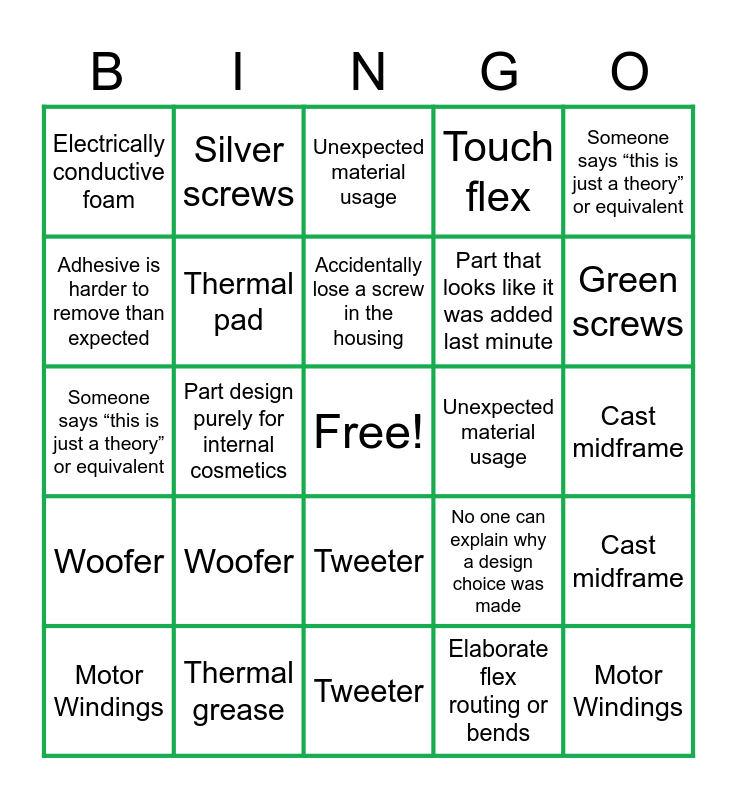 This bingo card has a free space and 48 words: Green screws, Motor Windings, Black screws, Tweeter, Woofer, Gold screws, Silver screws, Accidentally break something during teardown, Adhesive is harder to remove than expected, Thermal grease, Thermal pad, Touch flex, Cast midframe, No one can explain why a design choice was made, Connector that looks really hard to plug in, Unstuffed component, Accidentally lose a screw in the housing, Unexpected material usage, Foam cable sleeve, Someone says “this is just a theory” or equivalent, Part design purely for internal cosmetics, Elaborate flex routing or bends, Electrically conductive foam, Part that looks like it was added last minute, Part that looks like it was added last minute, Green screws, Motor Windings, Black screws, Tweeter, Woofer, Gold screws, Silver screws, Accidentally break something during teardown, Adhesive is harder to remove than expected, Thermal grease, Thermal pad, Touch flex, Cast midframe, No one can explain why a design choice was made, Connector that looks really hard to plug in, Unstuffed component, Accidentally lose a screw in the housing, Unexpected material usage, Foam cable sleeve, Someone says “this is just a theory” or equivalent, Part design purely for internal cosmetics, Elaborate flex routing or bends and Electrically conductive foam.