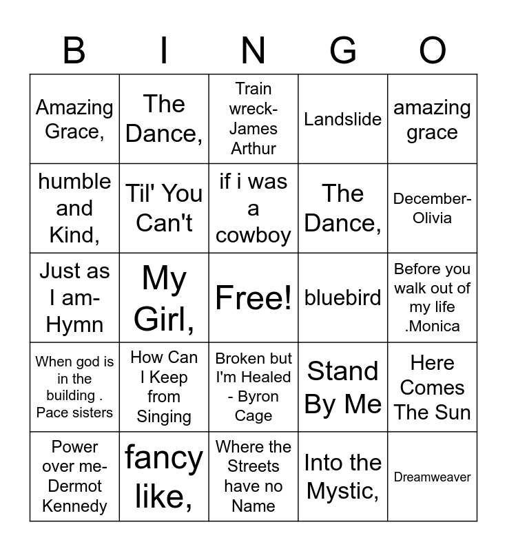This bingo card has a free space and 51 words: Ekki Hugsa, Dreamweaver, Irinaki, Where the Streets have no Name, How Can I Keep from Singing, eye of the tiger,, The Dance,, I hope you dance,, humble and Kind,, the climb, Til' You Can't, Landslide, Here Comes The Sun, Stand By Me, When It Rains It Pours, tennessee whiskey, if i was a cowboy, bluebird, slow down kinda night, amazing grace, My Girl,, Into the Mystic,, Amazing Grace,, The Dance,, Sounds of the Silence, What a fool believes-Doobie brothers, December-Olivia, One-Lewis Capaldi, Power over me-Dermot Kennedy, Train wreck-James Arthur, The Chain, by Fleetwood Mac., After Dark, by Mr. Kitty., I Miss You, by Adele., Loyalty, by Kendrick Lamar & Rihanna., Been Like This, by Doja Cat., fancy like,, tennessee whiskey,, do you feel like we do,, somehow somewhere someway,, the joker, Before you walk out of my life .Monica, When god is in the building . Pace sisters, look and live. Hymn, Blessed Assurance .Hymn, My soul been anchor . doug Miller, Tina Turner . whats love gotta due with it, Just as I am-Hymn, keep me-patrick Dopson, Change me - Tamela Mann, Broken but I'm Healed - Byron Cage and Withholding Nothing - William Mcdowell.