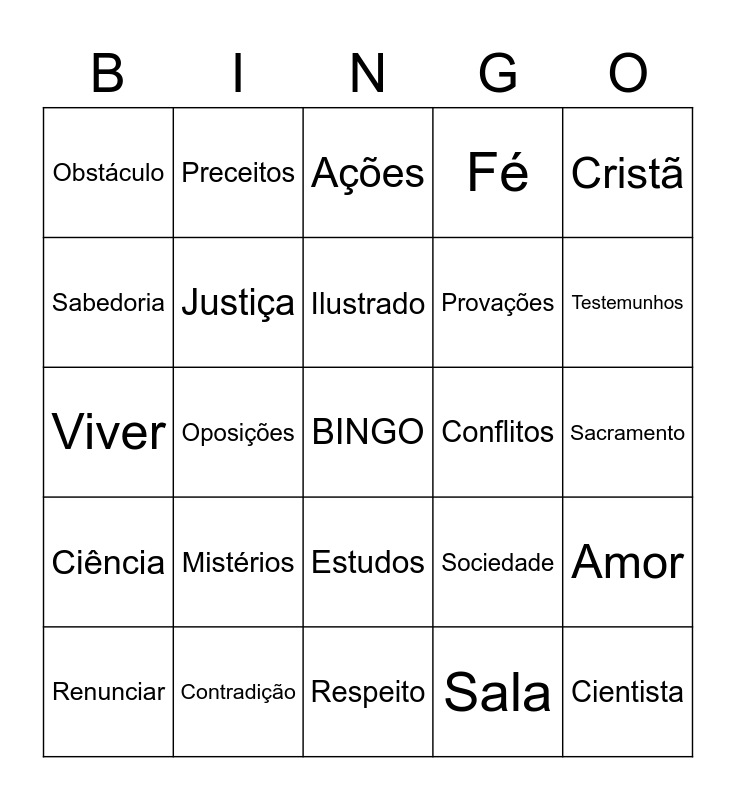 This bingo card has a free space and 24 words: Mistérios, Contradição, Ilustrado, Renunciar, Cristã, Obstáculo, Sabedoria, Preceitos, Conflitos, Estudos, Provações, Viver, Sociedade, Amor, Justiça, Sala, Sacramento, Ações, Testemunhos, Oposições, Cientista, Ciência, Fé and Respeito.