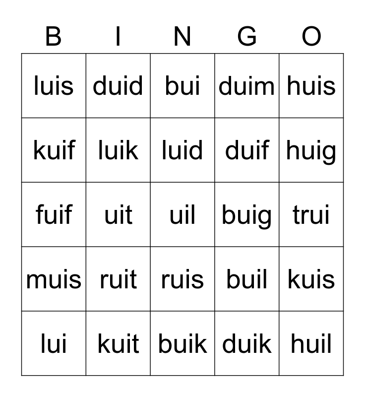 This bingo card has a free space and 29 words: lui, ui, uit, suis, luis, bui, luik, ruit, buig, kuit, trui, huil, buik, duik, huig, kuil, ruis, muis, huis, fuif, buil, buit, duif, kuif, duim, duid, kuis, luid and ruik.