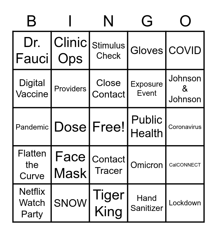This bingo card has a free space and 67 words: Antibodies, Asymptomatic, Booster, CalCONNECT, Case Investigator, CDC, Clinic Ops, Clinics, Close Contact, Command Center, Contact Tracer, Contagious, Coronavirus, COVID, Delta, Digital Vaccine, Dose, Dr. Fauci, Essential Workers, Exposure Event, Face Mask, Flatten the Curve, Gloves, Hand Sanitizer, Health & Human Services, Helpdesk, Innovation, Isolation, Johnson & Johnson, Live Chat, Lockdown, Moderna, My Turn, myCAvax, N95, Netflix Watch Party, New Normal, Omicron, Pandemic, Personal Protective Equipment, Pfizer, Providers, Public Health, Quarantine, Rapid Test, Salesforce, SARS-Cov-2, SNOW, Social Distancing, SPOT, Stimulus Check, Supply Chain, Swab, Symptoms, Teams, Tiger King, Toilet Paper, Training, Travel Restrictions, Vaccine, Vaccine Management, Virtual Happy Hour, Virus, WHO, Work From Home, You’re On Mute and Zoom.