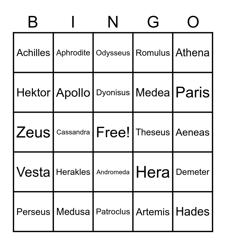 This bingo card has a free space and 24 words: Herakles, Medusa, Dyonisus, Perseus, Athena, Achilles, Hektor, Aphrodite, Theseus, Andromeda, Medea, Zeus, Hera, Demeter, Apollo, Artemis, Aeneas, Odysseus, Paris, Cassandra, Hades, Vesta, Romulus and Patroclus.