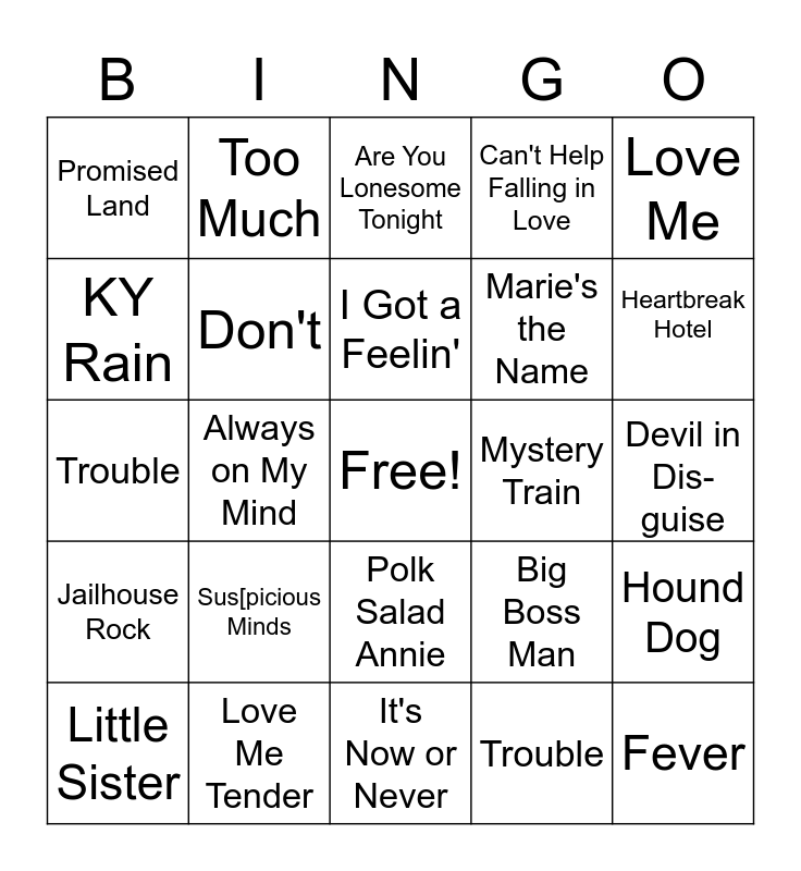 This bingo card has a free space and 38 words: That's All Right, All Shook Up, Burning Love, Don't, Hound Dog, Sus[picious Minds, I Got a Feelin', One Night, Love Me, Marie's the Name, Always on My Mind, Can't Help Falling in Love, Fever, Devil in Dis- guise, KY Rain, Jailhouse Rock, In the Ghetto, Are You Lonesome Tonight, Blue Suede Shoes, Mystery Train, Promised Land, Love Me Tender, Heartbreak Hotel, Little Sister, Viva Las Vegas, It's Now or Never, Teddy Bear, Want You, Need You Love You, A Little Less Talk a Little More Action, She's Not Your, Way Down, Polk Salad Annie, Trouble, Too Much, Hard Headed Woman, Big Boss Man, Trouble and Bossa Nova Baby.