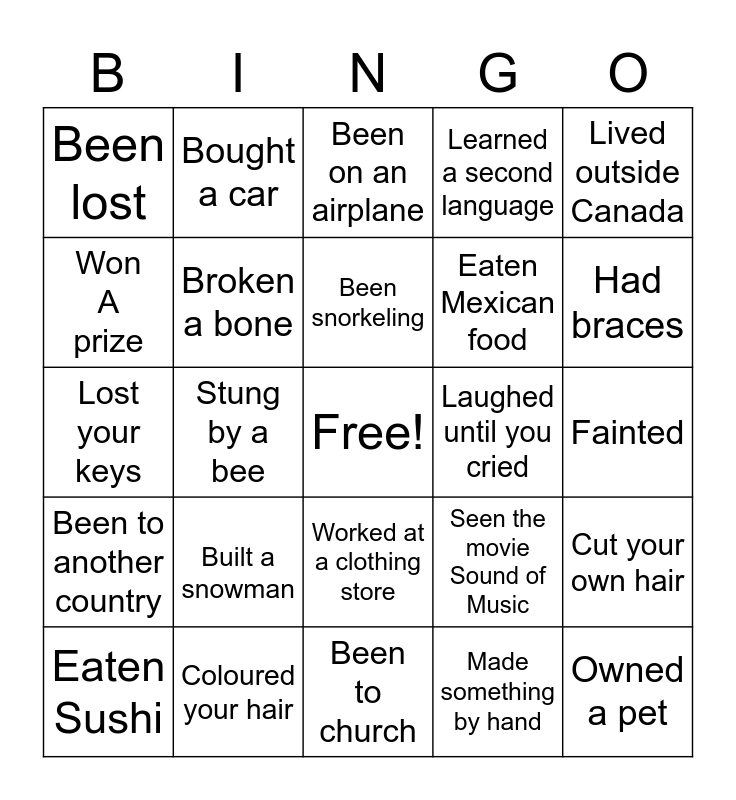 This bingo card has a free space and 24 words: Built a snowman, Coloured your hair, Been snorkeling, Eaten Sushi, Lived outside Canada, Been lost, Won A prize, Bought a car, Laughed until you cried, Worked at a clothing store, Eaten Mexican food, Lost your keys, Seen the movie Sound of Music, Cut your own hair, Broken a bone, Made something by hand, Fainted, Been on an airplane, Had braces, Stung by a bee, Owned a pet, Been to another country, Learned a second language and Been to church.