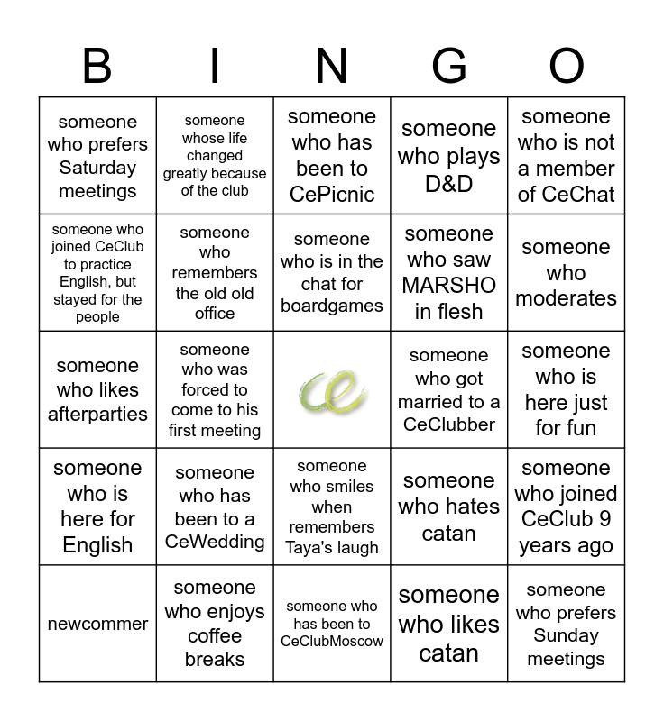 This bingo card has a free space and 24 words: newcommer, someone who has been to a CeWedding, someone who is in the chat for boardgames, someone who likes catan, someone who is not a member of CeChat, someone who prefers Saturday meetings, someone whose life changed greatly because of the club, someone who has been to CePicnic, someone who got married to a CeClubber, someone who is here just for fun, someone who likes afterparties, someone who remembers the old old office, someone who hates catan, someone who joined CeClub 9 years ago, someone who joined CeClub to practice English, but stayed for the people, someone who enjoys coffee breaks, someone who has been to CeClubMoscow, someone who plays D&D, someone who moderates, someone who is here for English, someone who was forced to come to his first meeting, someone who smiles when remembers Taya's laugh, someone who saw MARSHO in flesh and someone who prefers Sunday meetings.
