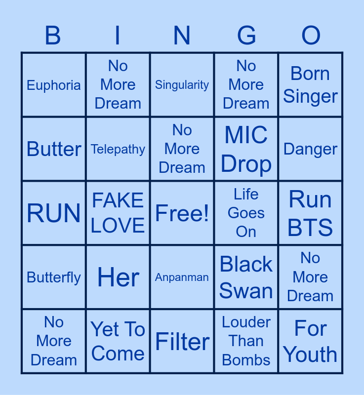 This bingo card has a free space and 29 words: No More Dream, DNA, FAKE LOVE, IDOL, Euphoria, Singularity, Telepathy, Her, Life Goes On, Yet To Come, Run BTS, For Youth, Filter, Louder Than Bombs, Danger, N.O, Anpanman, Butterfly, Born Singer, RUN, Black Swan, Spring Day, MIC Drop, Butter, No More Dream, No More Dream, No More Dream, No More Dream and No More Dream.