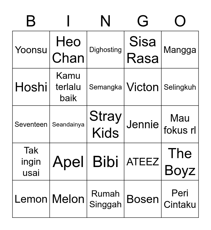 This bingo card has a free space and 24 words: Apel, Melon, Semangka, Lemon, Mangga, Yoonsu, Hoshi, Heo Chan, Jennie, Bibi, Victon, Seventeen, ATEEZ, The Boyz, Kamu terlalu baik, Bosen, Mau fokus rl, Dighosting, Selingkuh, Seandainya, Peri Cintaku, Tak ingin usai, Sisa Rasa and Rumah Singgah.