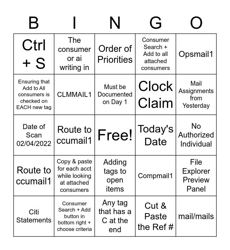 This bingo card has a free space and 27 words: Compmail1, Is this a Citi Account? c&d form, Clock Claim, Any tag that has a C at the end, Ensuring that Add to All consumers is checked on EACH new tag, Order of Priorities, The consumer or ai writing in, Route to ccumail1, Today's Date, File Explorer Preview Panel, Date of Scan 02/04/2022, Consumer Search + Add to all attached consumers, Citi Statements, Consumer Search + Add button in bottom right + choose criteria, Mail Assignments from Yesterday, Scrolling to the last page 1st to find the most recent accounts, CLMMAIL1, Must be Documented on Day 1, Copy & paste for each acct while looking at attached consumers, Ctrl + S, No Authorized Individual, Cut & Paste the Ref #, Route to ccumail1, mail/mails, Adding tags to open items, Opsmail1 and SCHMAIL1.