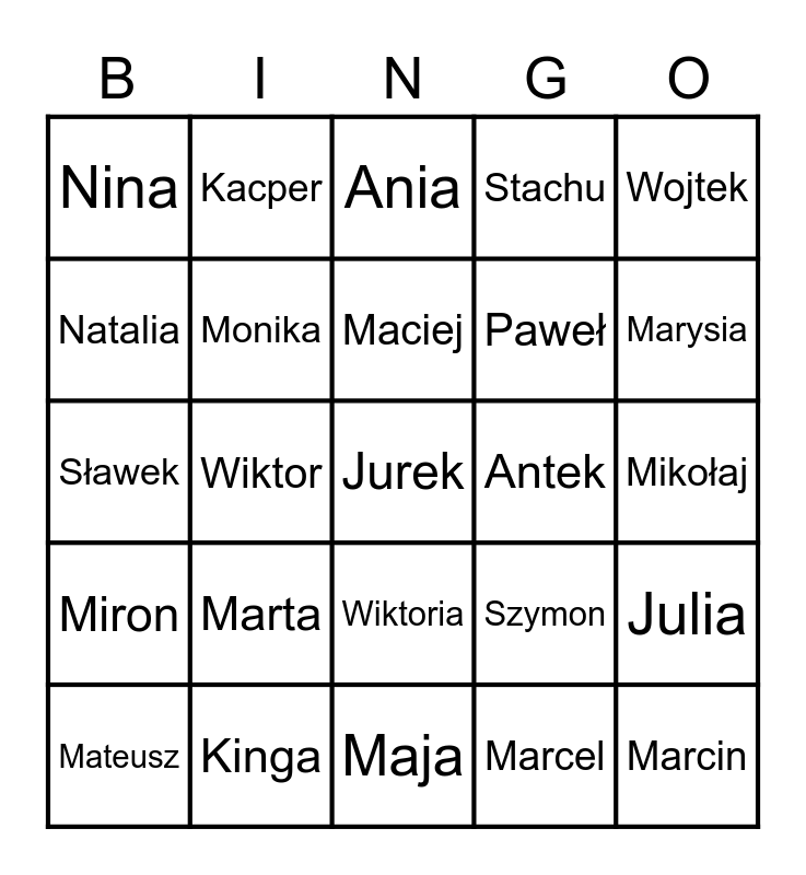 This bingo card has 25 words: Marta, Maja, Maciej, Mateusz, Wojtek, Nina, Natalia, Kacper, Antek, Wiktoria, Paweł, Sławek, Szymon, Julia, Monika, Marcin, Mikołaj, Ania, Marysia, Wiktor, Jurek, Kinga, Miron, Stachu and Marcel.