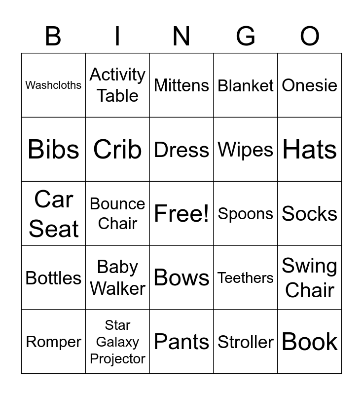 This bingo card has a free space and 24 words: Baby Walker, Star Galaxy Projector, Dress, Romper, Onesie, Washcloths, Bibs, Activity Table, Spoons, Bows, Wipes, Car Seat, Teethers, Swing Chair, Crib, Stroller, Socks, Mittens, Hats, Bounce Chair, Book, Bottles, Blanket and Pants.