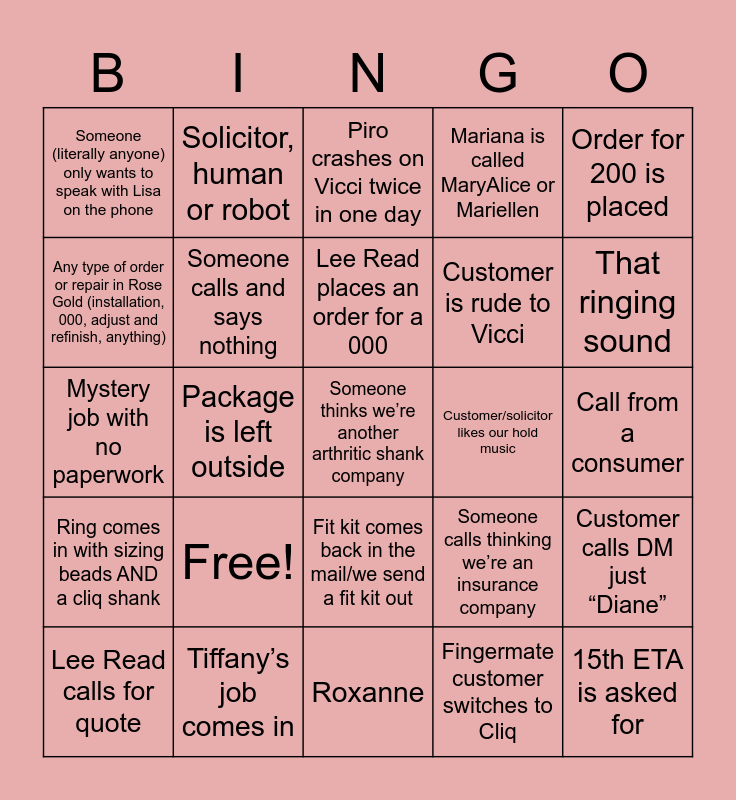 This bingo card has 25 words: Free!, Roxanne, Lee Read places an order for a 000, Lee Read calls for quote, Order for 200 is placed, Someone (literally anyone) only wants to speak with Lisa on the phone, Any type of order or repair in Rose Gold (installation, 000, adjust and refinish, anything), Solicitor, human or robot, Customer/solicitor likes our hold music, Fit kit comes back in the mail/we send a fit kit out, Customer is rude to Vicci, Mystery job with no paperwork, Someone calls thinking we’re an insurance company, Customer calls DM just “Diane”, Someone calls and says nothing, 15th ETA is asked for, Call from a consumer, Piro crashes on Vicci twice in one day, That ringing sound, Package is left outside, Someone thinks we’re another arthritic shank company, Tiffany’s job comes in, Ring comes in with sizing beads AND a cliq shank, Mariana is called MaryAlice or Mariellen and Fingermate customer switches to Cliq.