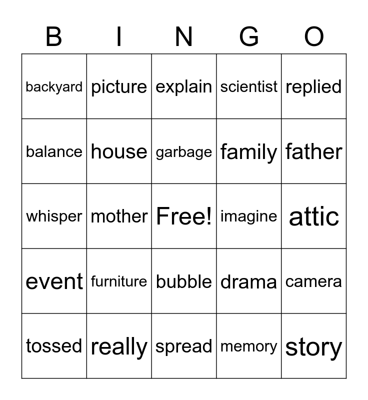 This bingo card has a free space and 24 words: furniture, really, garbage, tossed, replied, backyard, balance, picture, imagine, bubble, family, whisper, drama, camera, house, memory, attic, explain, father, mother, story, event, scientist and spread.