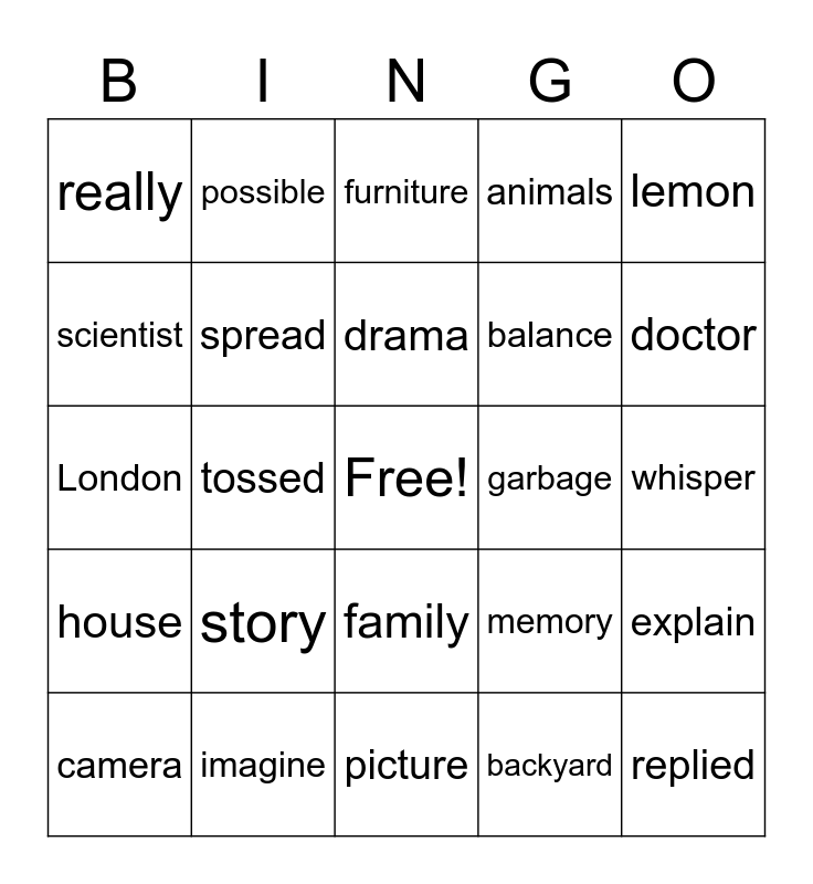 This bingo card has a free space and 28 words: explain, attic, balance, backyard, scientist, furniture, possible, house, garbage, camera, London, animals, imagine, picture, doctor, mother, story, spread, drama, family, really, bubble, replied, tossed, whisper, memory, lemon and father.