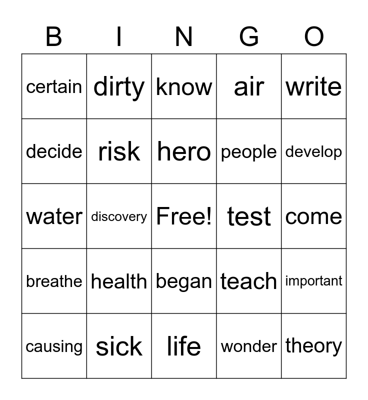 This bingo card has a free space and 29 words: causing, supply, discovery, bath, certain, know, risk, health, test, sick, come, theory, life, wonder, develop, stop, began, breathe, write, water, teach, spread, people, decide, air, dirty, important, hero and correct.