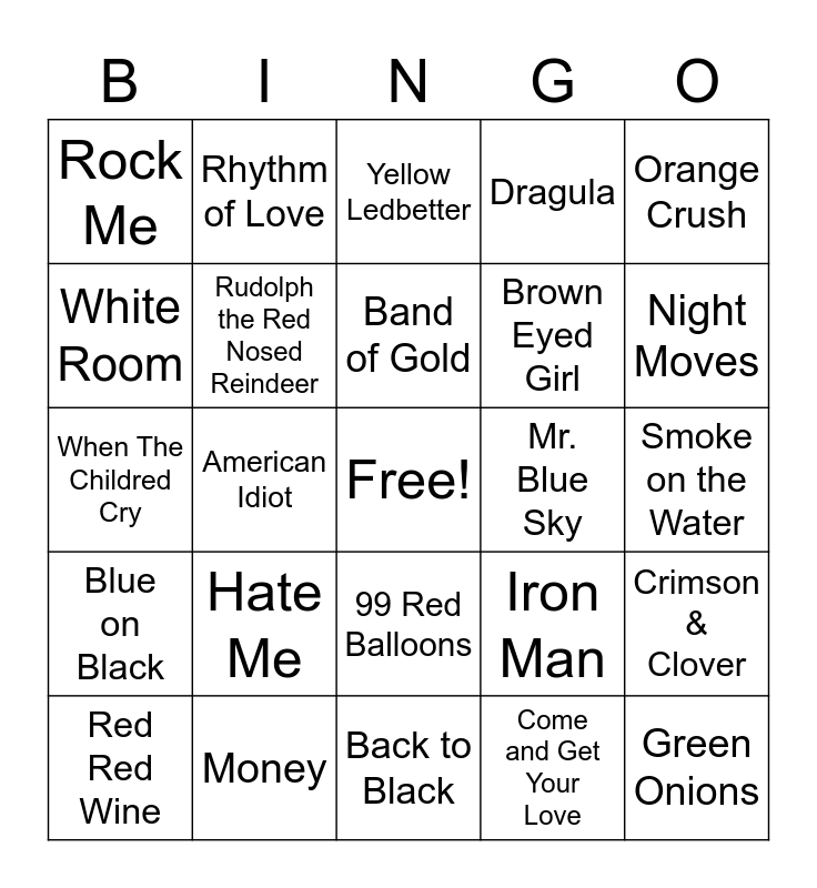 This bingo card has a free space and 58 words: Scar Tissue, Money, So What, Iron Man, Smoke on the Water, Seven Nation Army, American Idiot, Face Down, Dragula, Godzilla, White Room, This Love, Here I Go Again, Knee Deep, Ocean Avenue, Rock Me, Hate Me, Yellow Ledbetter, Hard to Handle, Night Moves, When The Childred Cry, Rhythm of Love, Everybody Needs Somebody to Love, Come and Get Your Love, White Trash Millionaire, Blue on Black, Yellow Submarine, Goodbye Yellow Brick Road, Brown Eyed Girl, Green Onions, Where the Green Grass Grows, Purple Rain, Purple Haze, Mellow Yellow, Crimson & Clover, Nights in White Satin, Blackbird, Band of Gold, Mr. Blue Sky, Baby's Got Her Blue Jeans On, Red Red Wine, I Guess That's Why They Call it the Blues, 99 Red Balloons, Lady in Red, Black Velvet, Fields of Gold, White Flag, Back to Black, Back in Black, Behind Blue Eyes, Black Hole Sun, Blue, Brown Sugar, Men in Black, Orange Crush, Paint it Black, Rudolph the Red Nosed Reindeer and White Wedding.