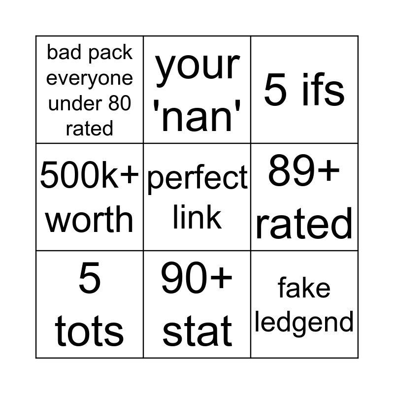 This bingo card has 9 words: 5 tots, 5 ifs, your 'nan', 500k+ worth, bad pack everyone under 80 rated, 89+ rated, perfect link, fake ledgend and 90+ stat.
