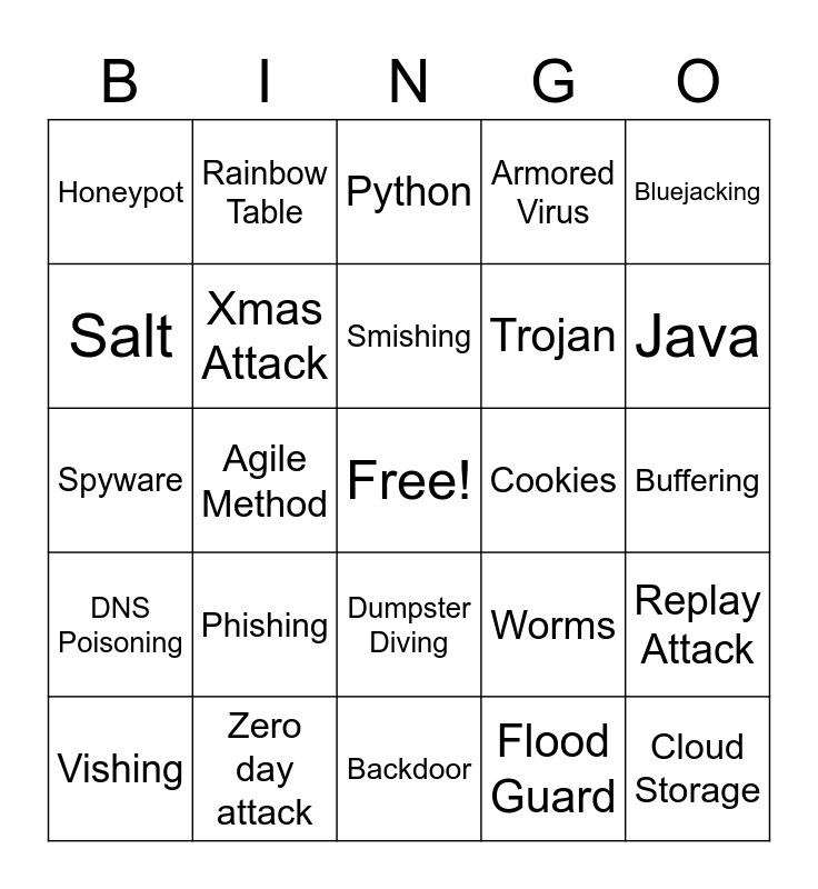 This bingo card has a free space and 24 words: Phishing, Zero day attack, Smishing, Vishing, Bluejacking, Honeypot, Salt, Rainbow Table, Cookies, Dumpster Diving, Trojan, Spyware, Worms, Replay Attack, Xmas Attack, Flood Guard, Buffering, Python, Java, Agile Method, Cloud Storage, DNS Poisoning, Armored Virus and Backdoor.
