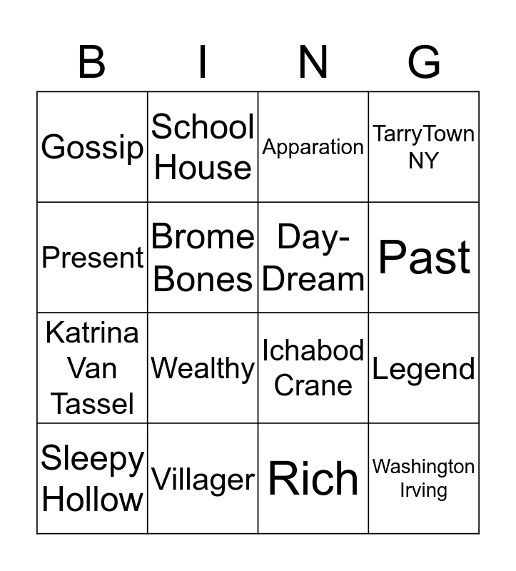 This bingo card has a free space and 15 words: Sleepy Hollow, Washington Irving, Apparation, Gossip, Past, Present, Wealthy, Rich, Brome Bones, Katrina Van Tassel, Legend, TarryTown NY, Day-Dream, School House and Villager.
