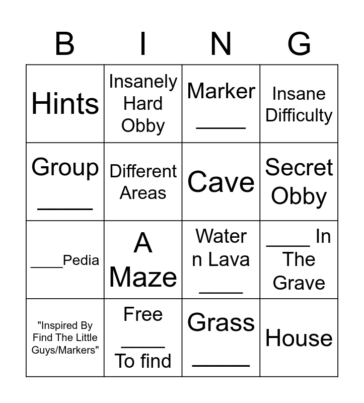 This bingo card has 16 words: Free ____ To find, ____ In The Grave, Marker ____, Hints, ____Pedia, Insanely Hard Obby, Water n Lava ____, Grass ____, Group ____, Different Areas, "Inspired By Find The Little Guys/Markers", Insane Difficulty, A Maze, Secret Obby, Cave and House.
