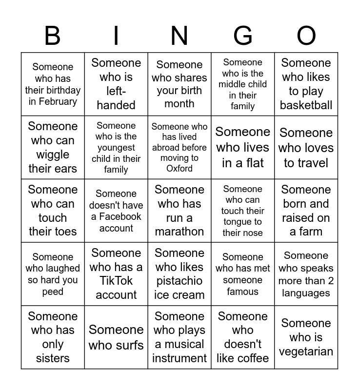 This bingo card has 25 words: Someone who has a TikTok account, Someone who plays a musical instrument, Someone who has lived abroad before moving to Oxford, Someone who has only sisters, Someone who likes to play basketball, Someone who has their birthday in February, Someone who can wiggle their ears, Someone who is left-handed, Someone who can touch their tongue to their nose, Someone who likes pistachio ice cream, Someone who lives in a flat, Someone who can touch their toes, Someone who has met someone famous, Someone who speaks more than 2 languages, Someone who is the youngest child in their family, Someone who is vegetarian, Someone born and raised on a farm, Someone who shares your birth month, Someone who loves to travel, Someone doesn't have a Facebook account, Someone who has run a marathon, Someone who surfs, Someone who laughed so hard you peed, Someone who is the middle child in their family and Someone who doesn't like coffee.