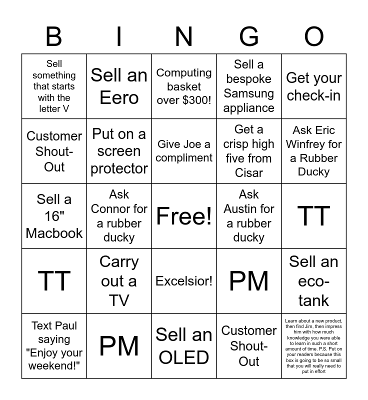 This bingo card has a free space and 24 words: Text Paul saying "Enjoy your weekend!", Carry out a TV, Give Joe a compliment, Customer Shout-Out, Get your check-in, Sell something that starts with the letter V, Sell an Eero, Computing basket over $300!, Ask Austin for a rubber ducky, TT, Sell a 16" Macbook, Put on a screen protector, PM, Sell an eco-tank, Customer Shout-Out, PM, Sell an OLED, Sell a bespoke Samsung appliance, Ask Eric Winfrey for a Rubber Ducky, TT, Ask Connor for a rubber ducky, Excelsior!, Get a crisp high five from Cisar and Learn about a new product, then find Jim, then impress him with how much knowledge you were able to learn in such a short amount of time. P.S. Put on your readers because this box is going to be so small that you will really need to put in effort.