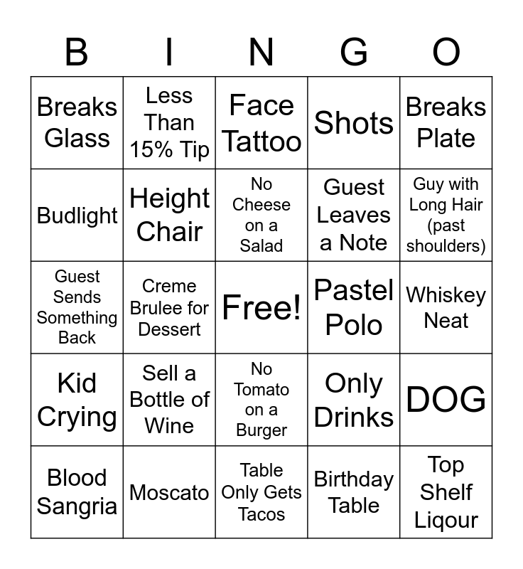 This bingo card has a free space and 24 words: Sell a Bottle of Wine, Moscato, No Cheese on a Salad, Blood Sangria, Breaks Plate, Breaks Glass, Budlight, Less Than 15% Tip, Pastel Polo, No Tomato on a Burger, Guest Leaves a Note, Guest Sends Something Back, Only Drinks, DOG, Height Chair, Birthday Table, Whiskey Neat, Face Tattoo, Guy with Long Hair (past shoulders), Creme Brulee for Dessert, Top Shelf Liqour, Kid Crying, Shots and Table Only Gets Tacos.
