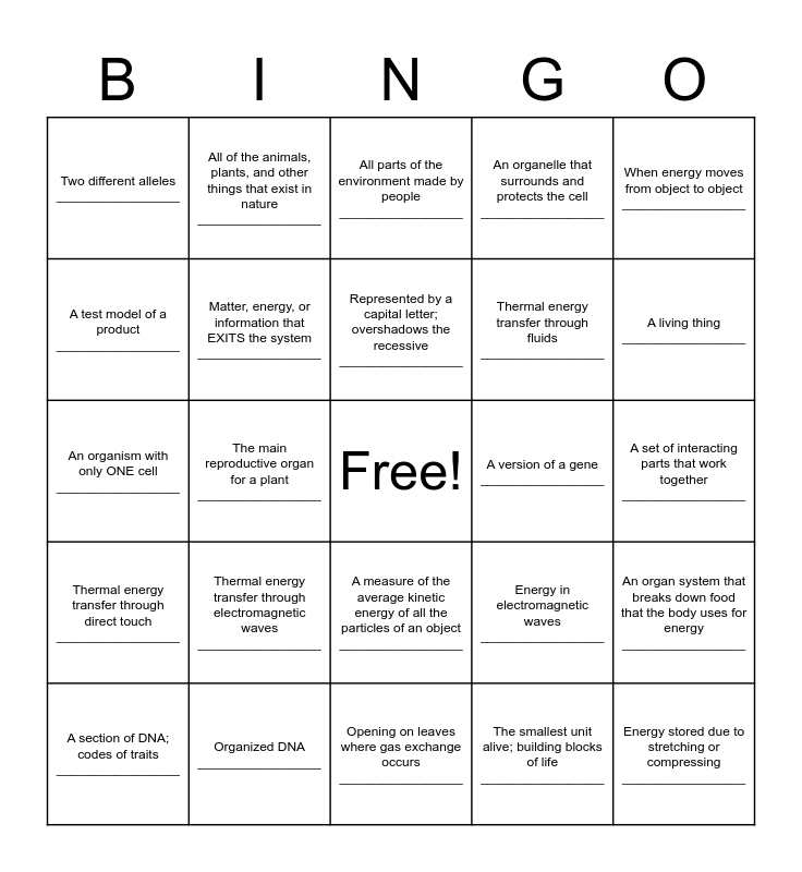 This bingo card has a free space and 92 words: Any tools, process, or system designed to solve a problem; human-made _________________, The study of phenomena in the natural world _________________, Opening on leaves where gas exchange occurs _________________, Limits of an engineering project _________________, The study of heredity _________________, The plant vascular tissue that transports sugar _________________, The male reproductive part on a flower _________________, A section of DNA; codes of traits _________________, An organelle that makes proteins _________________, A model that show structure (2D or 3D) _________________, Motion Energy _________________, An organelle that controls the function of the cell; contains DNA _________________, Energy transferred between two objects of different temperatures _________________, Thermal energy transfer through fluids _________________, A process where plants take energy from the sun and water to make sugar _________________, When energy moves from object to object _________________, All parts of the environment made by people _________________, The female reproductive part on a flower _________________, A group of CELLS working together _________________, An organism with more than one cell _________________, Parts of a system that work together _________________, An organelle that makes energy for the cell to use _________________, An organ system that removes waste from the body _________________, An organelle the provides structural support for the cell; found only in plant & bacteria cells _________________, Thermal energy transfer through electromagnetic waves _________________, Matter, energy, or information that EXITS the system _________________, Energy stored in chemical bonds _________________, The transfer of energy from a force to an object causing movement _________________, A decision making tool evaluating several options at the same time _________________, An organelle that completes the process of photosynthesis; found only in plant cells _________________, Organized DNA _________________, A measure of the average kinetic energy of all the particles of an object _________________, A tool used to make smaller object bigger _________________, Defines the edges of a system _________________, All of the animals, plants, and other things that exist in nature _________________, A type of cell that has a nucleus _________________, A tools used to predict genotypes and phenotypes of offspring _________________, Energy stored in the nucleus of an atom _________________, Represented by a capital letter; overshadows the recessive _________________, Energy in electromagnetic waves _________________, An organism with only ONE cell _________________, Thermal energy transfer through direct touch _________________, A set of interacting parts that work together _________________, An organ system that takes in oxygen and releases carbon dioxide; breathing _________________, Energy stored due to stretching or compressing _________________, The set of genes inherited; represented by two letters _________________, A group of TISSUES working together _________________, Needs of an engineering project _________________, The systematic practice of solving problems with designed solutions _________________, A physical trait determined by the genotype _________________, A model that shows relationships and interactions between parts _________________, When energy changes from one form to another _________________, A replica of a real thing; used to gain understanding of something _________________, The plant organ system above ground _________________, A material that speeds up the rate of heat transfer _________________, The passing of traits from parent to offspring _________________, An organ system that carries oxygen around the body in blood _________________, A test model of a product _________________, The plant organ used primarily for photosynthesis _________________, The main reproductive organ for a plant _________________, The plant vascular tissue that transports water _________________, The design and use of tools that copy natural structures or processes _________________, The unit of measurement for work and energy _________________, An organ system that controls all functions and collects information _________________, An organelle that is gel-like and surrounds all organelles in the cell _________________, The smallest unit alive; building blocks of life _________________, The plant organ used to collect water from the ground and store sugar _________________, Energy due to the height of an object off the ground _________________, A type of design testing that is repeated many times _________________, The ability to do work _________________, The plant organ system below ground _________________, Energy of moving electric charges _________________, An organelle that surrounds and protects the cell _________________, Matter, energy, or information that ENTERS the system _________________, The organ in plant responsible for transportation of water and sugar _________________, Energy due to position and motion (KE + PE) _________________, An organ system that breaks down food that the body uses for energy _________________, An organ system that allows for movement _________________, Energy is never created or destroyed, but it can be transferred or transformed _________________, Represented by a lowercase letter; overshadowed by dominant _________________, Stored Energy _________________, A version of a gene _________________, Two different alleles _________________, A group pf ORGANS working together _________________, The total kinetic energy of a substance's particles _________________, A model that is made of numbers and equations _________________, Contains information that directs all function in a living thing; can be organized into chromosomes _________________, A characteristic; what is inherited from parents _________
