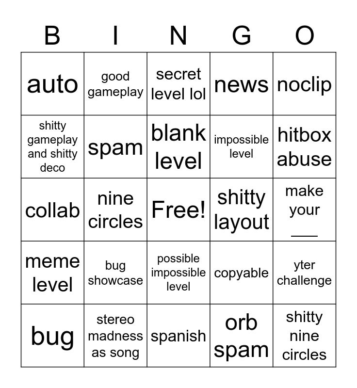 This bingo card has a free space and 24 words: bug showcase, stereo madness as song, blank level, bug, noclip, auto, shitty gameplay and shitty deco, good gameplay, shitty layout, possible impossible level, impossible level, collab, copyable, yter challenge, spam, orb spam, make your ___, secret level lol, hitbox abuse, nine circles, shitty nine circles, meme level, news and spanish.