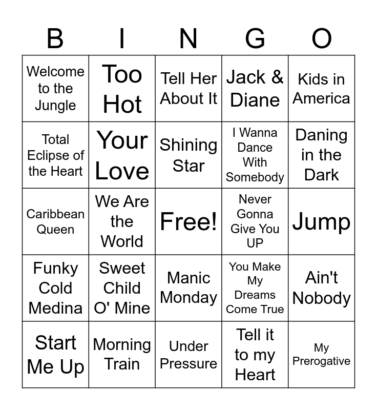 This bingo card has a free space and 89 words: Part-Time Lover, Rapper's Delight, Manic Monday, Open Your Heart, Sailing, What's Love Got to Do With It, Tainted Love, Express Yourself, Get Outta My Dreams, Get Into My Car, Every Little Step, Kiss on My List, Call Me, Ain't Nobody, Jump, Come on Eileen, Shining Star, Jam On It, Uptown Girl, Don't Stop Believin', Take On Me, Baby, Come to Me, Cruisin', Under Pressure, Karma Chameleon, Caribbean Queen, Morning Train, Mr. Roboto, Walk Like an Egyptian, Faith, Push It, Jack & Diane, We Are the World, Girls Just Want to Have Fun, Welcome to the Jungle, Ladies Night, Tell Her About It, Total Eclipse of the Heart, Walking on Sunshine, Daning in the Dark, Start Me Up, Funky Cold Medina, Wild Thing, Free Fallin', I Love Rock N Roll, You Make My Dreams Come True, Never Gonna Give You UP, I'm Coming Out, Living on a Prayer, I'm So Excited, Too Hot, She Works Hard for the Money, All Out of Love, All Night Long, Bust a Move, Super Freak, Cover Girl, We Got the Beat, Rosana, Against the Wind, Love is a Battlefield, Let's Groove, Alone, Hungry Like the Wolf, Physical, Jessie's Girl, The Message, Girl You Know It's True, Wake Me Up Before You Go-Go, Straight Up, Sweet Child O' Mine, My Prerogative, Easy Lover, Down Under, I Wanna Dance With Somebody, Your Love, Tell it to my Heart, Maneater, Celebration, Billie Jean, Addicted to Love, Kids in America, It's Tricky, Just a Friend, Fight For Your Right, No Sleep Till Brooklyn, Hello, Smooth Operator, Just Got Paid and Back to Life.